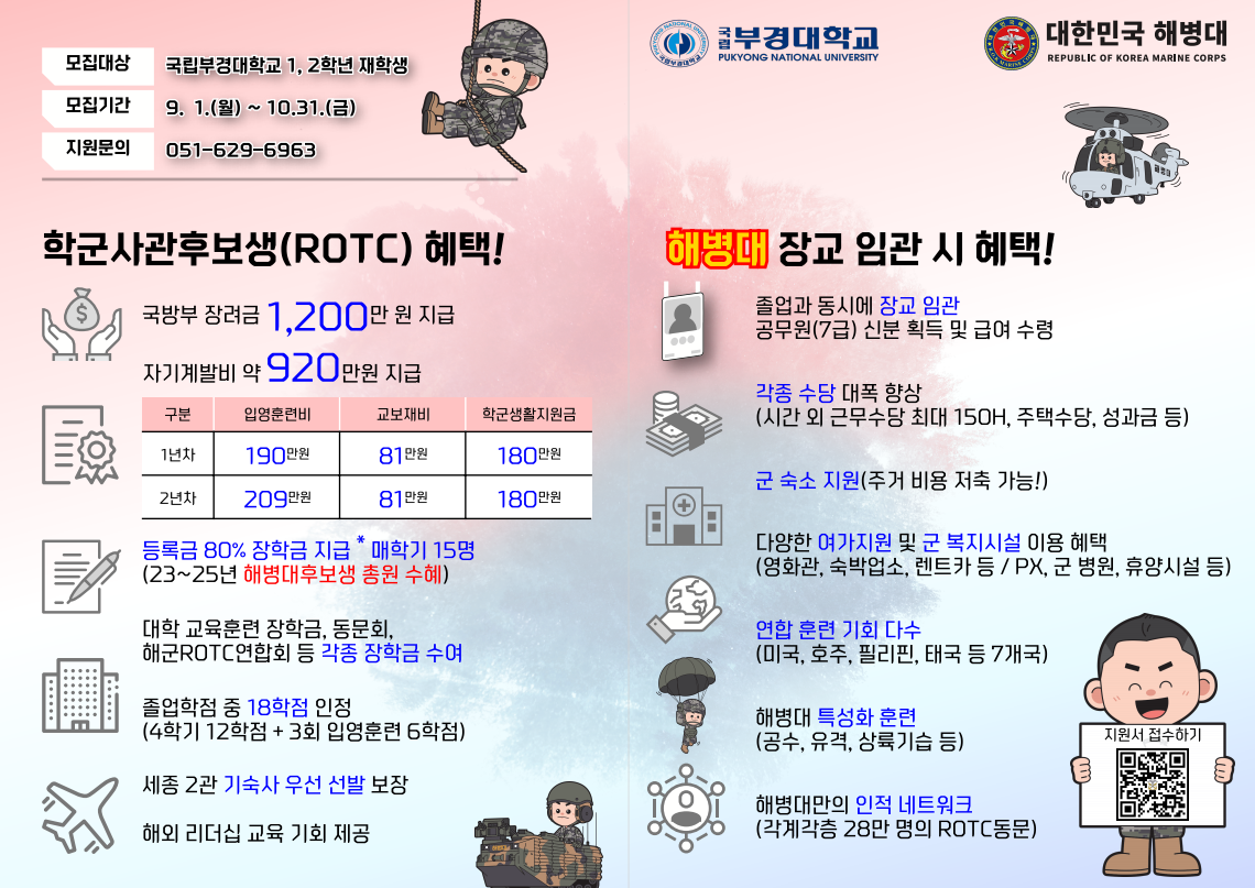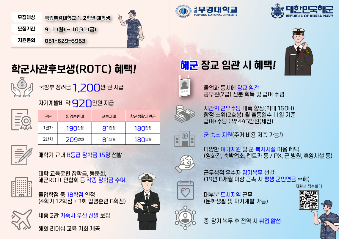 2025년 해군/해병대 ROTC 후보생을 모집이 이달 말일 종료됩니다. 1, 2학년 재학생 여러분의 많은 지원 바랍니다! 모집 기간: 10월 31일(금) 까지 지원 대상: 현재 1, 2학년 재학생(5년제 학과 3학년까지) ROTC는 대학생활과 군 복무를 함께 준비할 수 있는 제도이며, 장학 혜택과 더불어 리더십 역량도 기를 수 있는 좋은 기회입니다. 자세한 사항은 학군단 홈페이지 또는 인스타 참고 바랍니다! 홈페이지:https://icms.pknu.ac.kr/nrotc DM : @pknu_nrotc_official