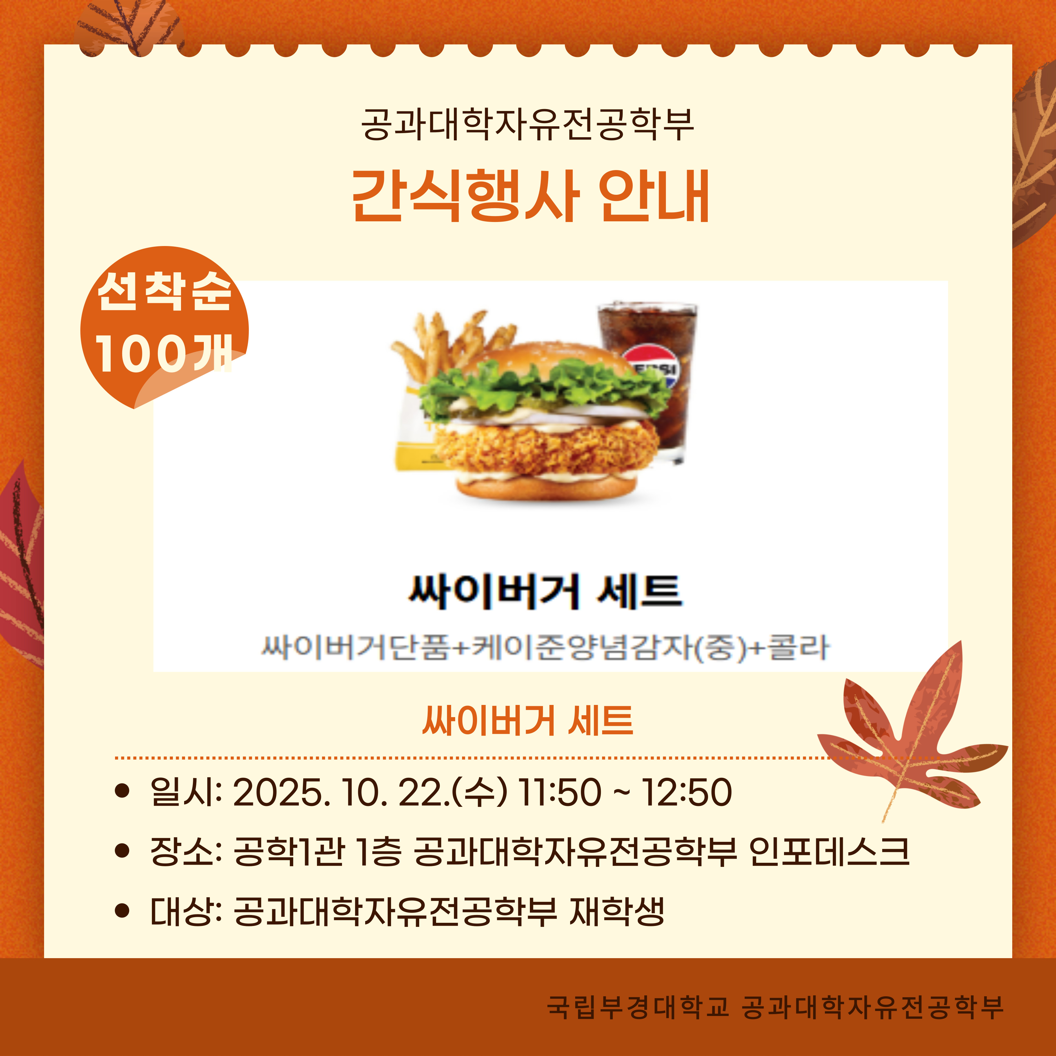 [공과대학자유전공학부 중간고사 응원전 - 간식행사 안내] 1. 일시: 2025. 10. 22.(수) 11:50 ~ 12:50 2. 장소: 공학 1관 1층 공과대학자유전공학부 인포데스크 3. 간식: 싸이버거 세트 < 싸이버거단품 + 케이준양념감자(중) + 콜라 캔> 4. 수량: 100개 (선착순 배부) 가. 학생증 필요 (모바일 학생증 가능) 나. 학생증 확인후 (배부 및 수령대장 작성) 5. 기타: 간단한 학사 및 대학생활 상담 실시 붙임 1. 2025-2학기 중간고사 응원전-간식행사(공자전) 1 1부. 2. 2025-2학기 중간고사 응원전-간식행사(공자전) 2 1부. |