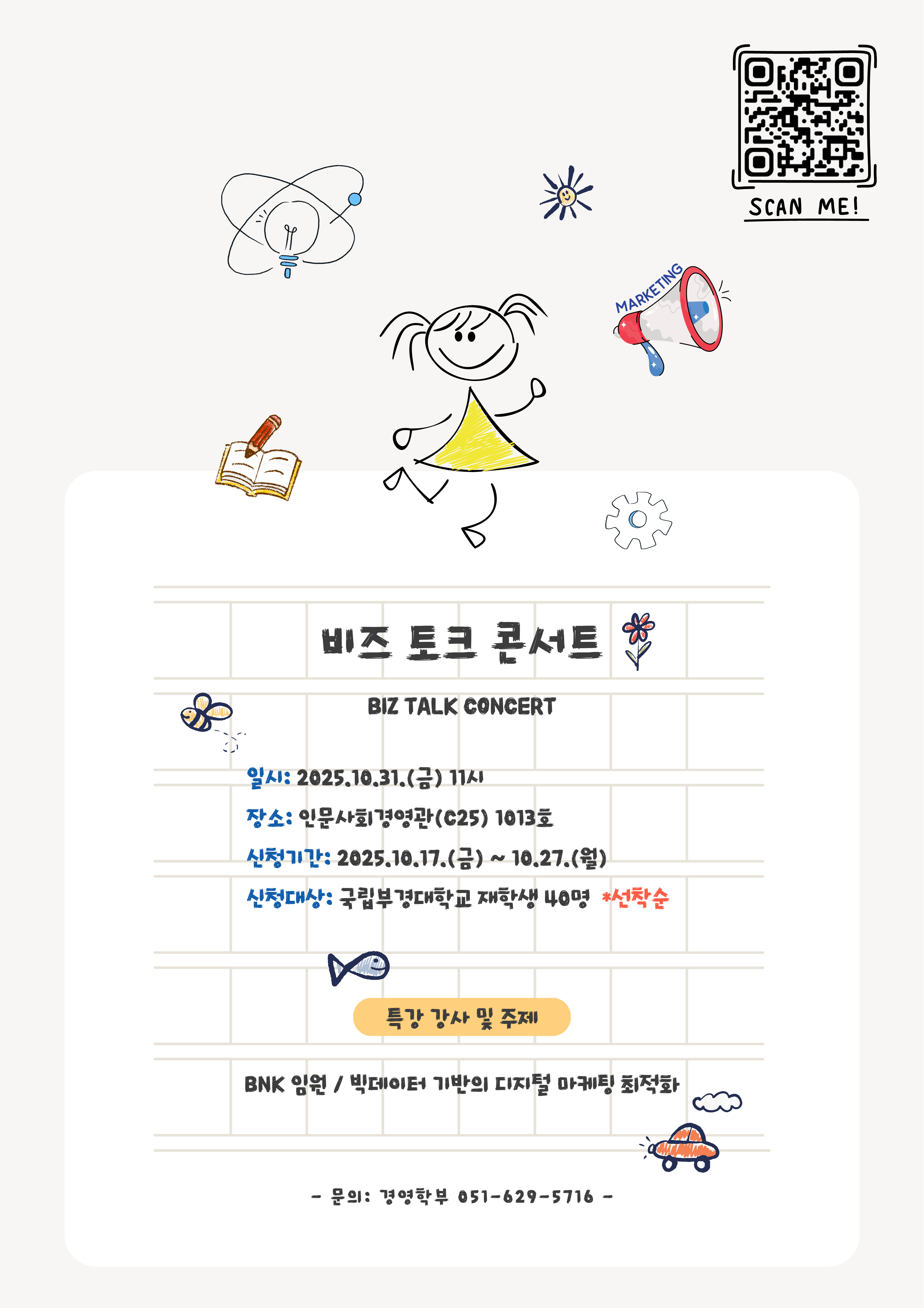 가. 행사 개요 - 일 시: 2025.10.31.(금) 11:00 - 장 소: 국립부경대학교 인문사회경영관(C25) 1013호 - 주 최: 경영대학 경영학부 - 참석대상: 국립부경대학교 재학생 40여명 - 특강주제: 빅데이터 기반의 디지털 마케팅 최적화 - 특강강사: BNK 임원 - 신청방법: 국립부경대포털(portal.pknu.ac.kr) 로그인 → 부경AI → 비교과(웨일비) → 비교과 프로그램(비즈토크콘서트) → 신청하기 |