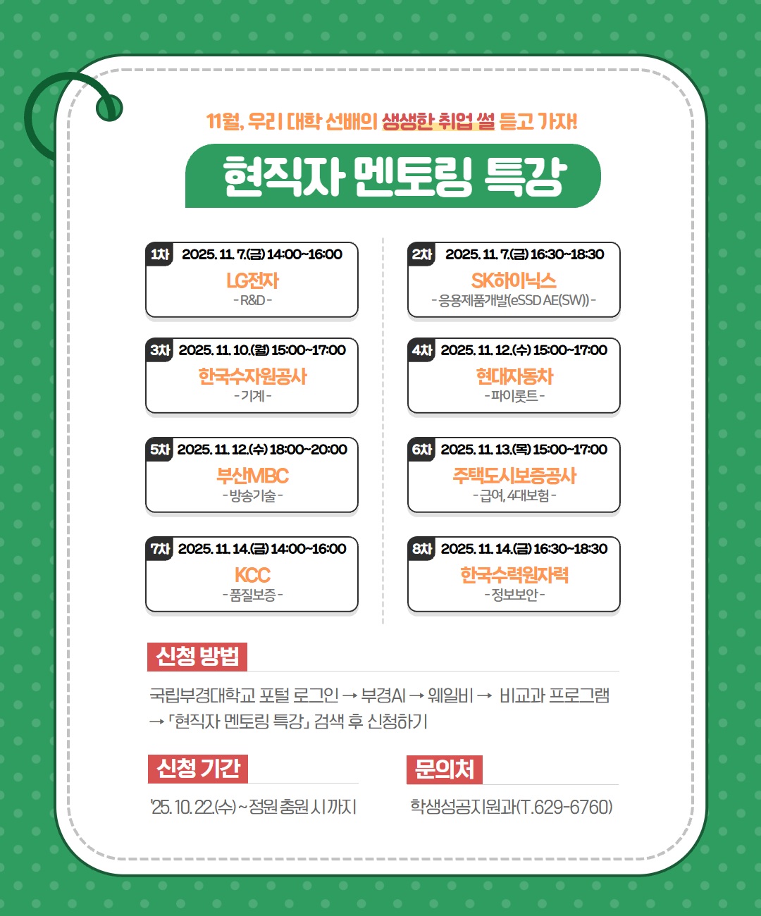 : 부경AI > 비교과(웨일비) > "현직자 멘토링 특강" 검색 후 신청하기