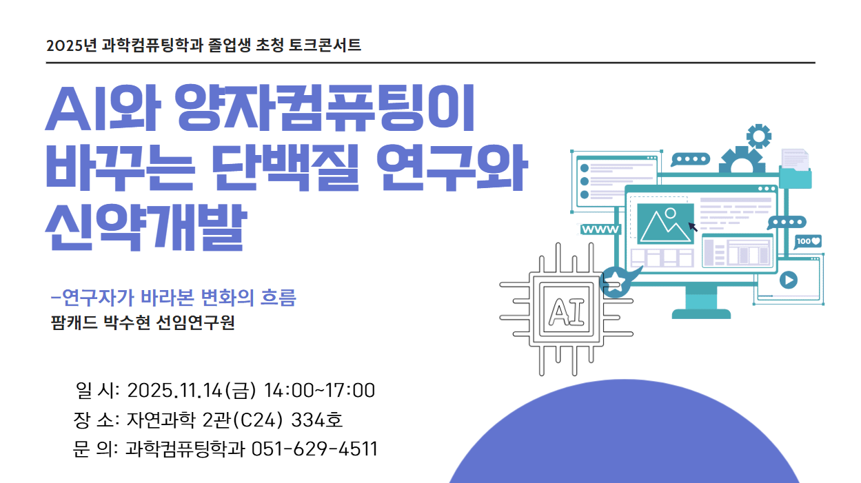 1. 행사 개요 1) 일 시: 2025.11.14.(금) 14:00~17:00 2) 장 소: 자연과학2관(C24) 334호 3) 주 제: AI와 양자컴퓨팅이 바꾸는 단백질 연구와 신약개발 - 연구자가 바라본 변화의 흐름 4) 연 사: 박수현 선임연구원/팜캐드 5) 참석대상: 국립부경대학교 재학생