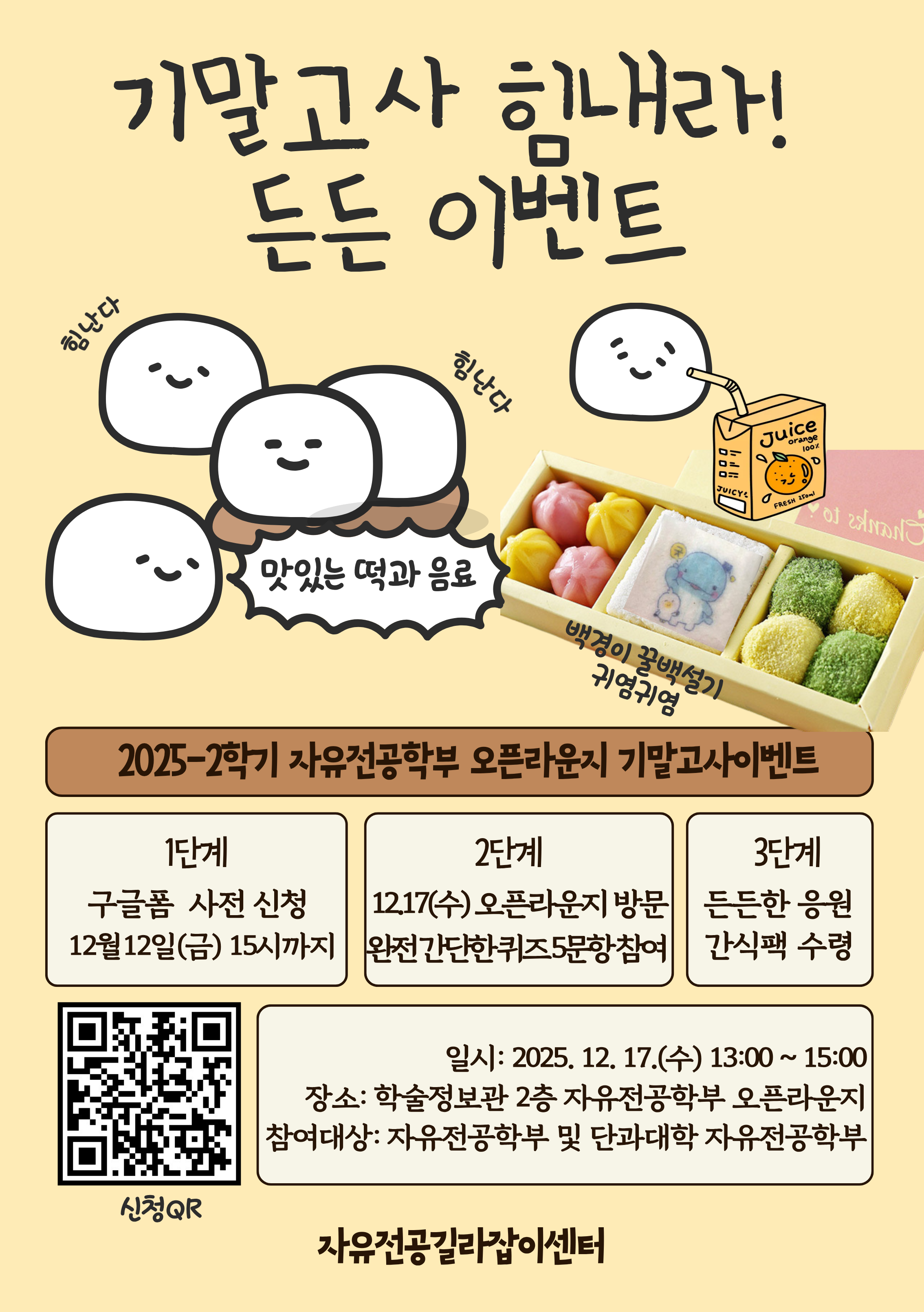 자유전공길라잡이센터에서는 기말고사 기간 학생들의 학업 스트레스 완화하고자 기말고사 이벤트를 실시하오니, 자유전공학부 학생분들의 많은 참여 바랍니다. 1. 프로그램명: 2025학년도 자유전공학부 오픈라운지 기말고사 이벤트 2. 신청 기간: ~ ’25. 12. 12.(금) 15:00 까지 (선착순 400명) 3. 신청 대상: 본부 및 단대 자유전공학부 재학생 (공과대학자유전공학부 포함) 4. 신청 방법: 구글폼 접수 https://forms.gle/bPhwcH3bKU9C99fs5 5. 일시 및 장소: ’25. 12. 17.(수)13:00 ~ 15:00 학술정보관 2층 자유전공학부 오픈라운지