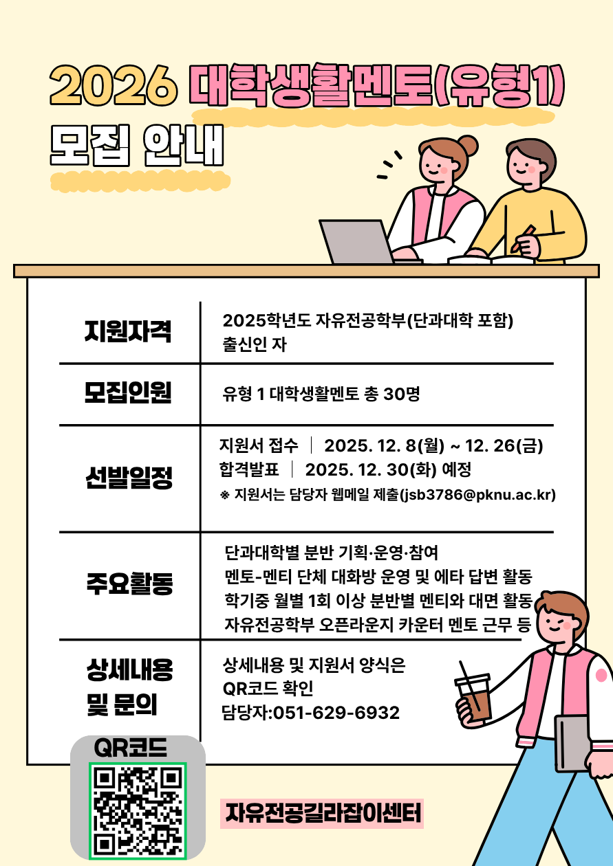 ◈ 자유전공길라잡이센터는 2026학년도 자유전공학부 신입생의 대학생활적응 지원을 위하여 2026학년도 자유전공학부 유형 1 대학생활멘토단 모집합니다. 아래의 모집 사항 관련 내용 확인 및 많은 지원 부탁드리겠습니다. 1. 모집대상: 2025학년도 자유전공학부(단과대학 포함) 출신인 자 2. 모집인원: 유형1 대학생활멘토 총 30명 3. 제출자료 및 방법 - 2026학년도 유형 1 대학생활멘토단 지원서 및 오픈라운지 근무 희망 시간표 1부, - 담당자 웹메일(jsb3786@pknu.ac.kr)로 제출 ※ 2026학년도 대학생활멘토단 상세내용 및 유형1 대학생활멘토단 지원서 서식은 [붙임] 자료 확인 4. 제출기한: ~ 2025. 12. 26.(금) 23:59 5. 합격자 발표: 2025. 12. 30.(화) 예정 ※ 합격자 대상 개별 문자 발송 및 홈페이지 내 결과 공지 예정 6. 문의사항: 051-629-6932