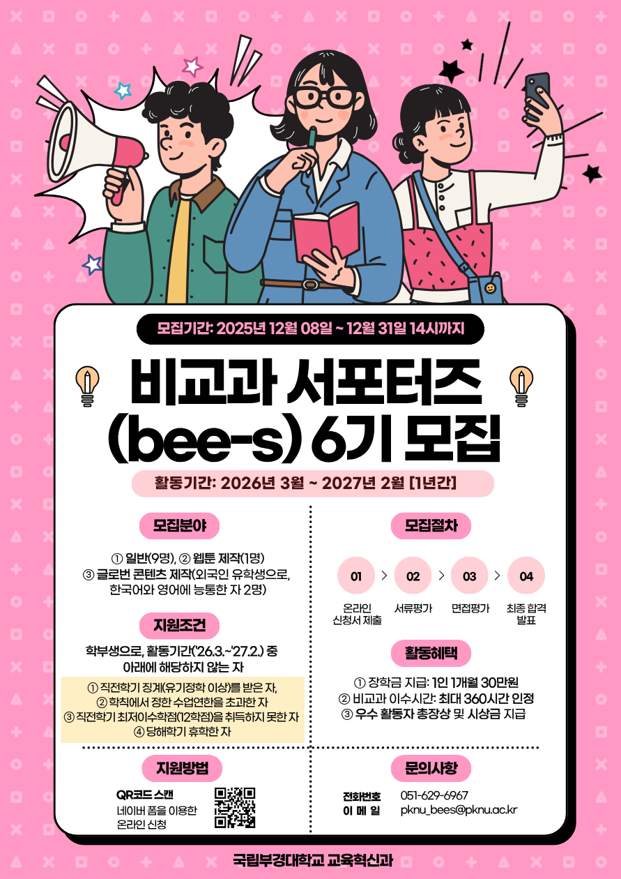 - 지원방법: 네이버 폼(신청링크: https://naver.me/FZ8yNwKw)을 이용한 온라인 신청 - 모집기간: 2025. 12. 8.(월) ~ 31.(수) 14:00 나. 제6기 비교과 서포터즈(bee-s) 운영개요 - 활동기간: 2026년 3월 ~ 2027년 2월[1년간] - 활동내용: 비교과 교육과정 홍보·모니터링·운영부서 업무 지원 등 - 활동지원: 1인 1개월 30만원 장학금 지급, 비교과 이수시간 최대 360시간 인정 |