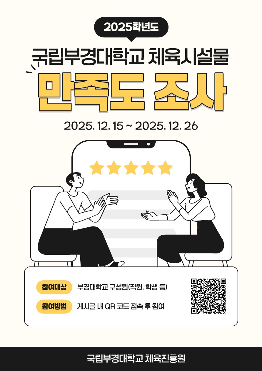 체육진흥원에서는 체육시설물 서비스 개선 및 체육시설물의 외부인 개방에 대한 구성원 의견을 수렴하기 위하여 아래와 같이 체육시설물 만족도 조사를 실시하오니 많은 참여바랍니다. 1. 조사기간: 2025.12.15.(월) ~ 12.26.(금) 2. 조사대상: 학내구성원(재학생 및 교직원 등) 3. 참여방법 - 설문조사 참여 URL:https://forms.gle/ArVzHzhkNrwZS52T8 - 안내문 내 QR코드 활용