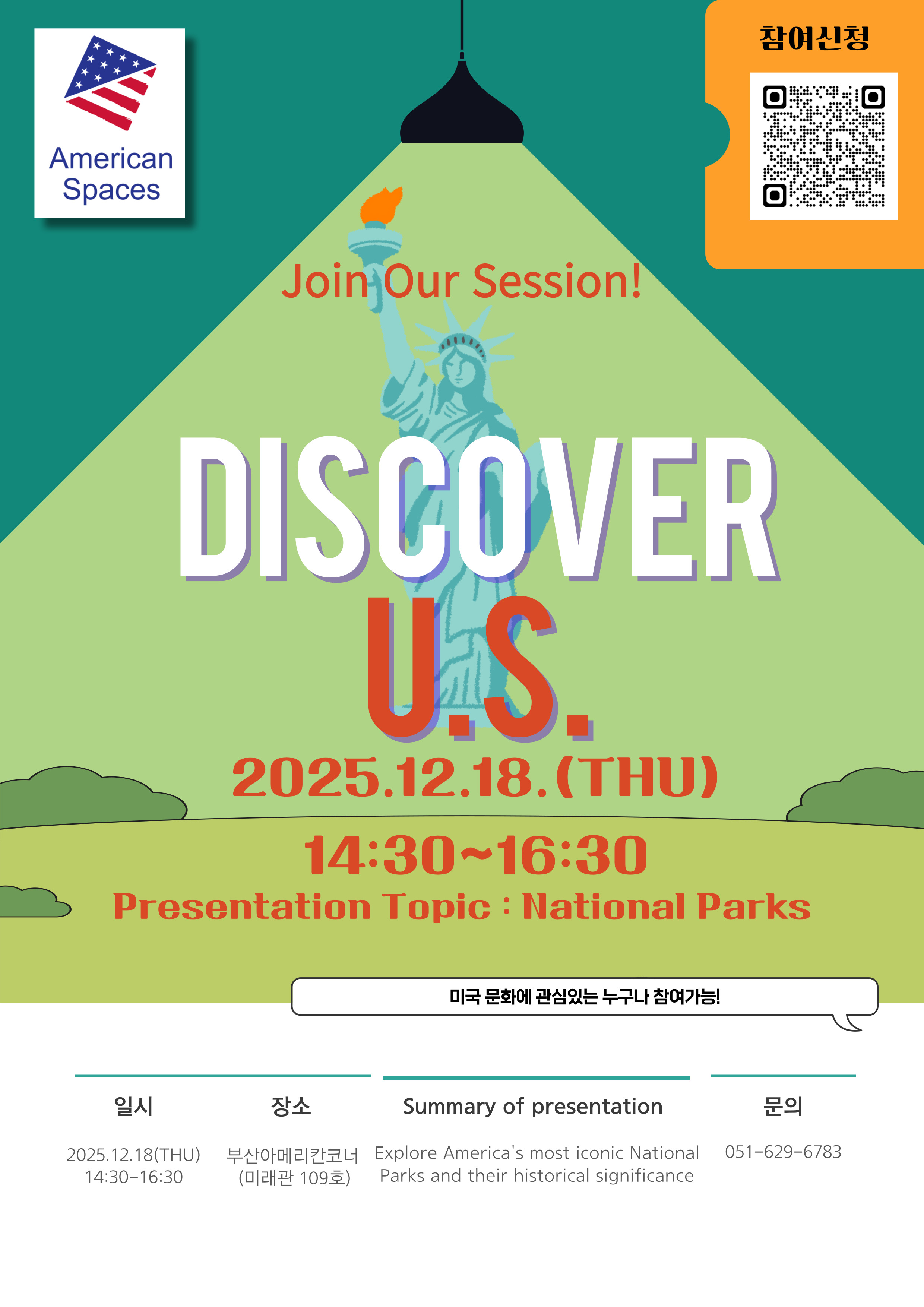 □ 프로그램 개요 ○ 일 시: 2025. 12. 18.(목) 14:30 ~ 16:30 ○ 장 소: 부산아메리칸코너 [미래관(A21) 109호] ○ 주 제: Explore America’s most iconic National Parks and their historical significance ○ 연 사: Aaron W. Shayne, 주한미국대사관 Adam Hennings 외교관 □ 신청방법: 온라인 사전 신청 필요 ※ 구글 폼을 활용한 QR코드 접속 & 신청 (QR코드: 붙임의 행사 포스터 하단 참조) 구글폼 URL:https://forms.gle/VmzZ1PRYxpMSqnRB7 □ 참고사항: 영어회화 초보자 가능, 기념품 증정 예정 □ 문의처: 국제교류본부 글로벌어학교육센터 (☏051-629-6783)