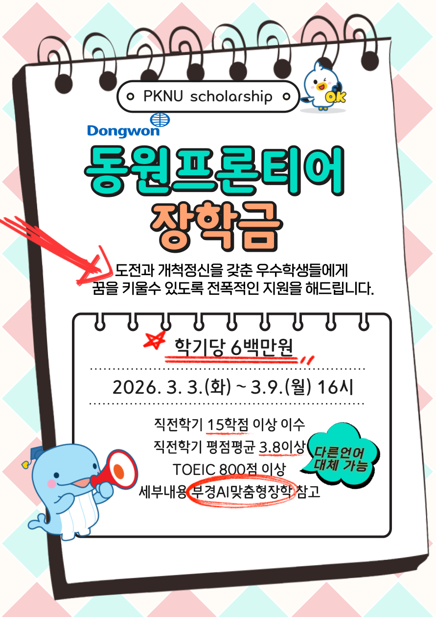 2026학년도 (재)동원학술연구재단 동원프론티어장학금 장학생을 아래와 같이 선발하오니, 학생분들의 많은 지원 바랍니다. 1. 선발인원: 신규자 6명 내외(계속지급자 제외) 2. 장 학 금: 학기당 600만원(학업지원비) ※ 타장학금과 중복수혜 가능, 졸업할때까지 연 1,200만원씩 지원(조건 충족시) 3. 지원대상: 국립부경대학교 학부 재학생(외국인유학생 포함) 4. 신청기간: 2026. 3. 3.(화) ~ 3. 9.(월) 16:00까지 5. 신청방법: 부경AI 맞춤형장학 온라인 신청