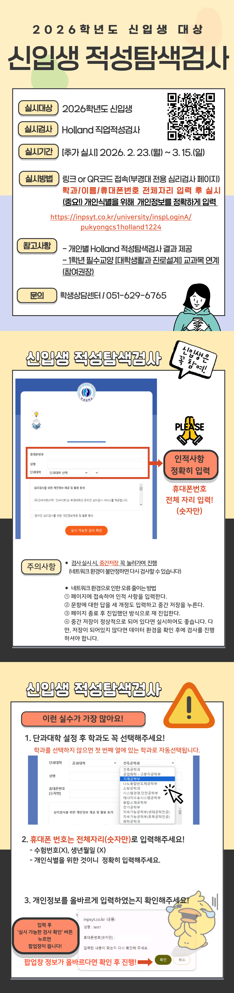 *추가실시 기간: 2026. 2. 23.(월) ~ 3. 15.(일) 1. 추가실시 기간: 2026. 2. 23.(월) ~ 3. 15.(일) 2. 대상: 2026학년도 신입생 3. 실시방법 안내문(첨부파일)을 반드시 읽은 후 실시 바랍니다. (개인정보 정확히 입력할 것) 검사는 1인 1회만 가능, 검사 완료 후 본인의 결과를 바로 확인하실 수 있으며, PDF로 저장해두시길 권장드립니다. 4. 검사링크: https://inpsyt.co.kr/university/inspLoginA/pukyongcs1holland1224 5. 문의: 학생상담센터(051-629-6765) 붙임 1. 신입생 적성탐색검사 실시방법 안내(2026) 1부. 2. 2026학년도 신입생 대상 신입생 적성탐색검사(포스터) 1부. 끝. |
