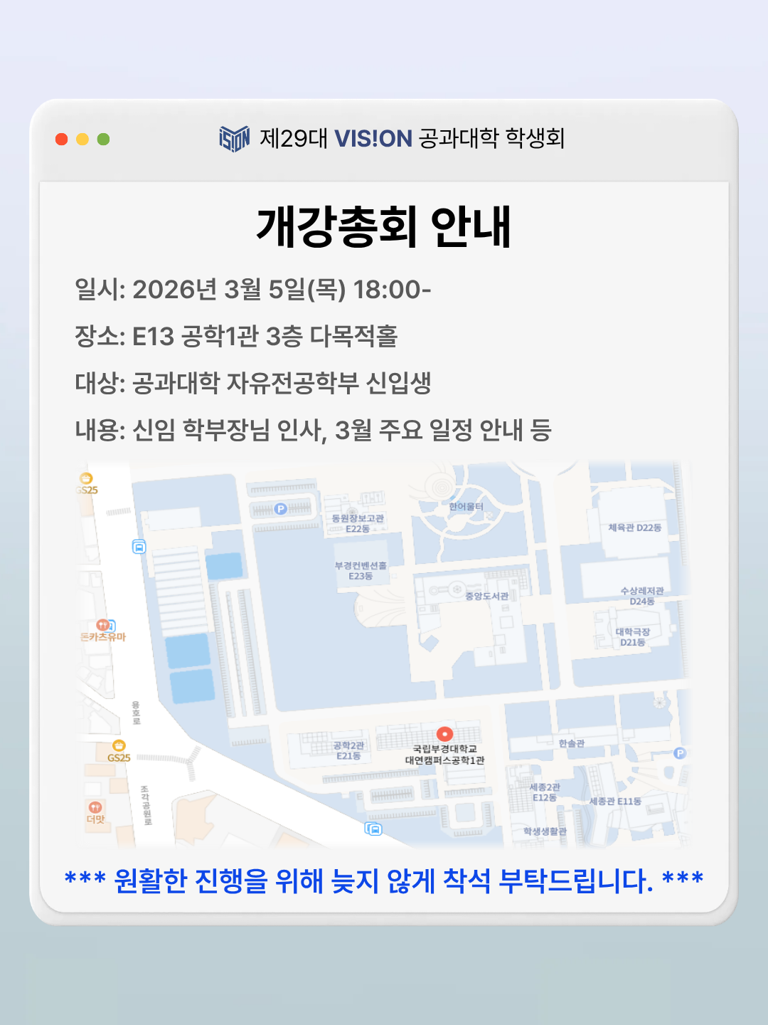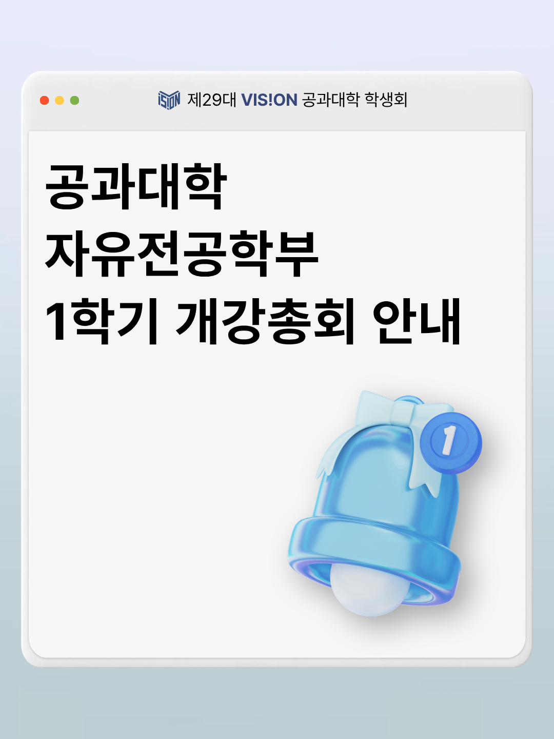 2026학년도 1학기 공과대학자유전공학부 개강총회 안내 1. 일시: 2026. 3. 5.(목) 1부 18:00 ~ 18:30 (주관: 공과대학자유전공학부)