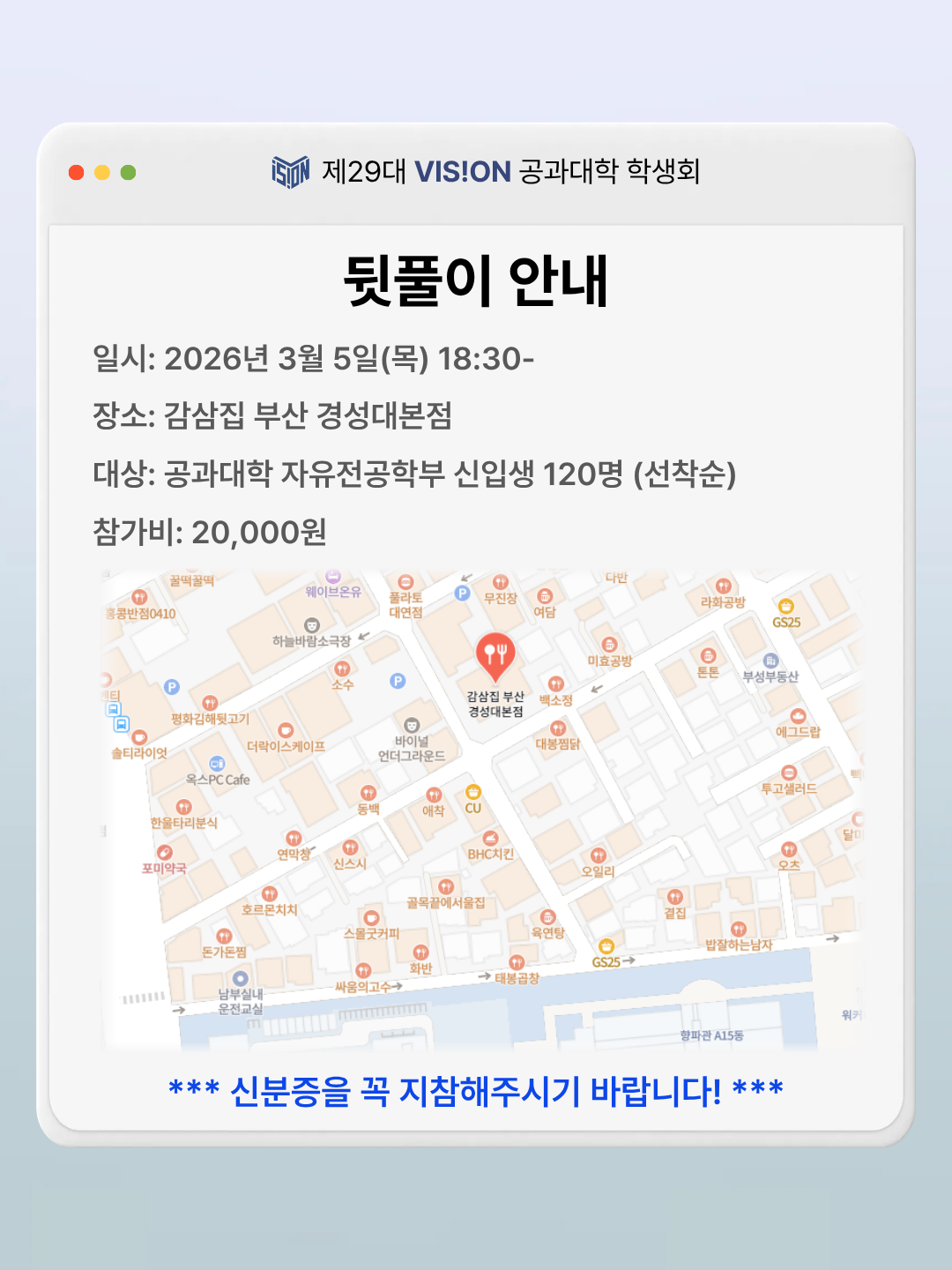 2. 장소: 공학 1관 3층 다목적 홀, 이후 인근 식당 이동 3. 내용 가. 학부장님 및 전담 선생님 소개 나. 주요 공지 안내 다. 인근 식당 이동 2026학년도 공과대학자유전공학부 신입생 학생들의 많은 참여 바랍니다. |