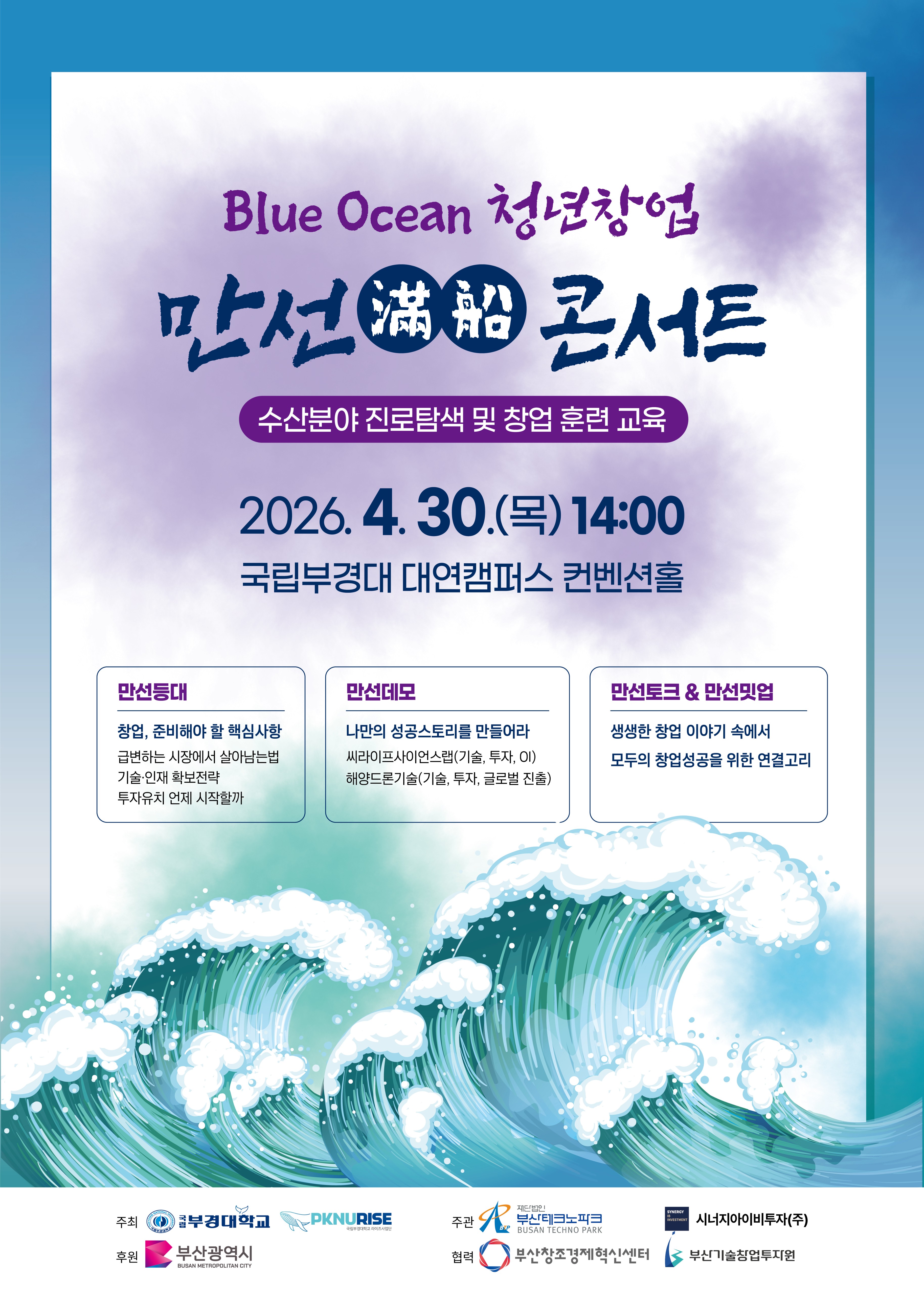 해양수산 산업 분야의 유기적 협력체계 구축과 청년층의 관심 및 참여 확대를 위하여 「2026 Blue Ocean 청년창업 만선(滿船) 콘서트」를 개최하오니, 많은 참여 바랍니다. 1. 행 사 명: 2026「Blue Ocean 청년창업」만선(滿船) 콘서트 2. 행사일시: 2026. 4. 30.(목) 14:00 ∼ 18:00 3. 행사장소: 국립부경대학교 대연캠퍼스 부경컨벤션홀 4. 참석대상: 부산지역 대학(원)생, 예비 및 초기창업자 등 150명 내외 5. 운영내용: 수산분야 진로탐색 및 창업 훈련 교육, 성공사례 공유 및 네트워킹 운영 등