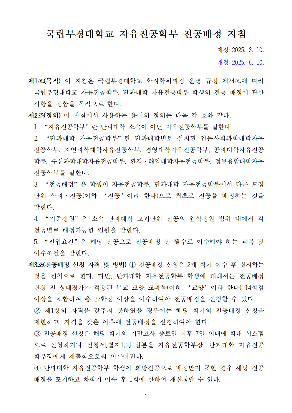 | 국립부경대학교 자유전공학부 전공배정 지침 전문(개정 250610) | |||