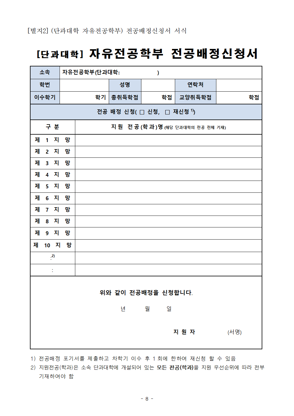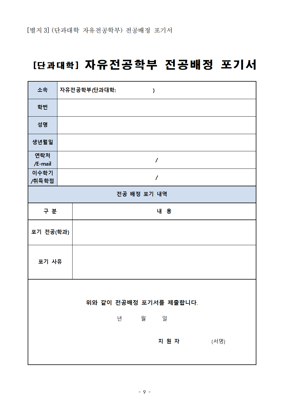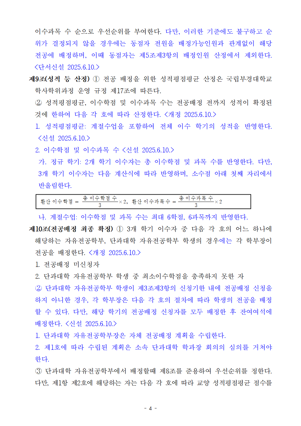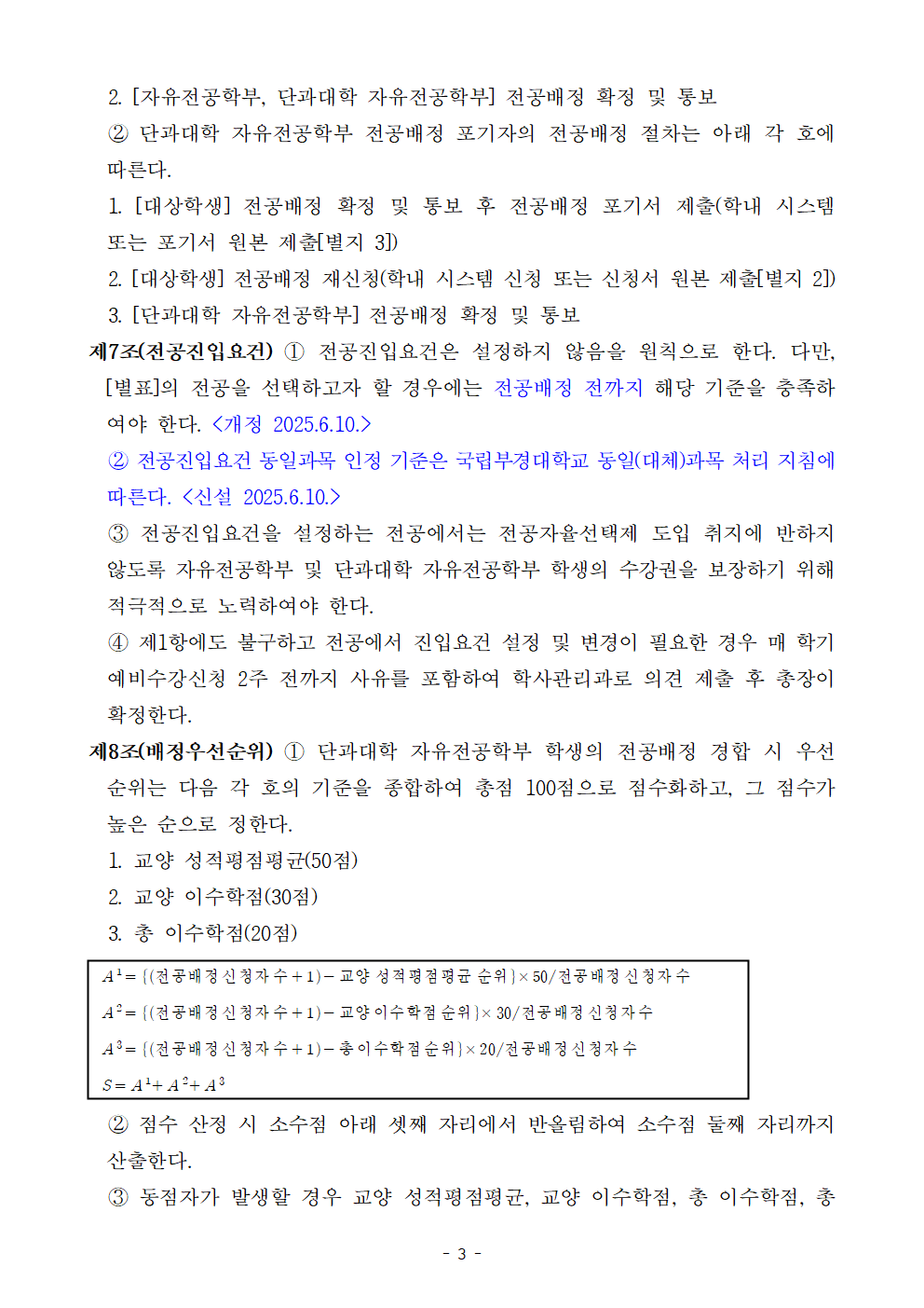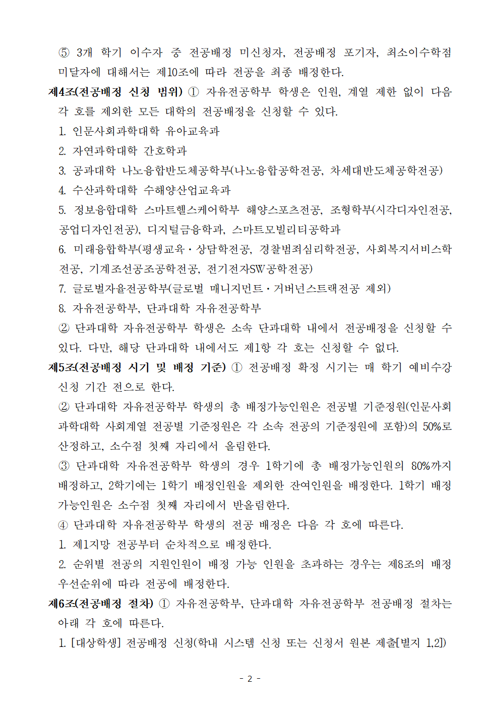 배정가능인원과 관계 없이 동점자 전원 해당 전공에 배정 (이때 동점자는 2학기 배정가능인원 산정에서 제외) - 2개 학기 이수자 및 3개 학기 이수자의 형평성을 고려하여 성적 등 산정 기준 개정 - 단과대학 자유전공학부 학생이 신청기한 내 전공배정 신청을 하지 아니한 경우 전공배정 절차 신설 붙임 국립부경대학교 자유전공학부 전공배정 지침 전문 1부. 끝.