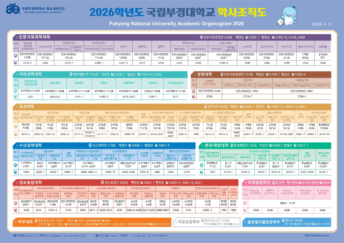 2026학년도 국립부경대학교 학사조직도(기준 2026.3.1.) 입니다. 대학 생활에 참고 바랍니다.