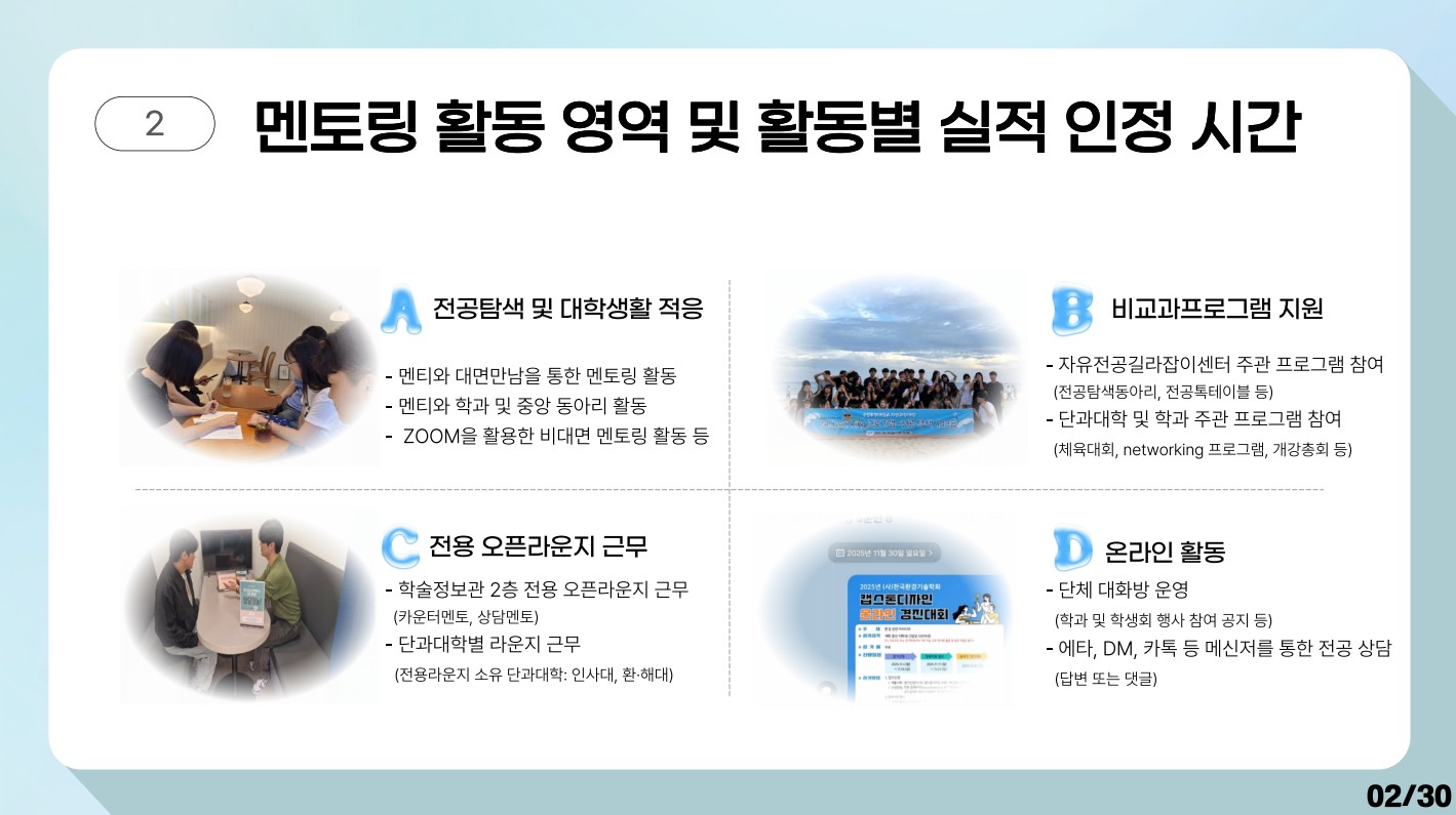 2. 활동일지 작성 방법 가. "멘토링 활동일지"를 작성 후, "학사행정정보시스템"에 입력/첨부 제출 합니다. 나. 멘토링 활동일지는 "총 4개 분야"로 이루어져 있습니다. 분야 1: 전공탐색 및 대학생활 적응 분야 2: 비교과프로그램 지원 분야 3: 전용 오픈라운지 근무 분야 4: 온라인 활동 (단체 대화방 또는 온라인 상담) 다. 각 분야 별 설명 분야 1: 전공탐색 및 대학생활 적응활동 분야 2: 비교과프로그램 지원 : "공과대학자유전공학부 주관 근무"를 기입하시면 됩니다. 예시: 공과대학자유전공학부 개강총회, 종강총회, 네트워킹 프로그램, 한끼토크, 무엇이든 물어보세요, 공대 자전인의 밤 등. 분야 3: 전용 오픈라운지 근무 : 자유전공길라잡이센터 주관의 중앙도서관 2층 자유전공학부 오픈라운지 근무를 기입하시면 됩니다. 분야 4: 온라인 활동 (단체 대화방 또는 온라인 상담) : 온라인 활동을 기입하시면 됩니다.