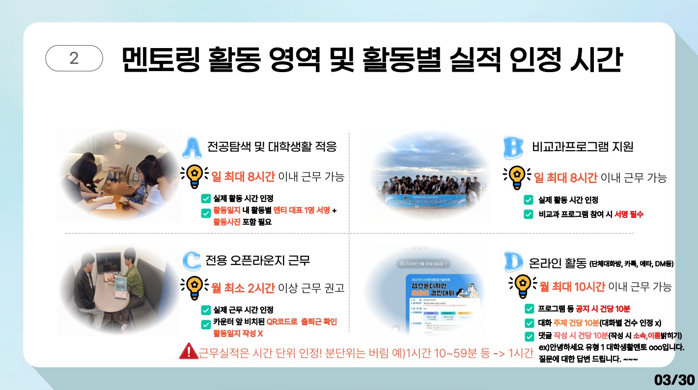 "근무 시간(중앙도서관 오픈라운지 근무)"는 다른 "멘토링 활동 프로그램" 시간과 겹치면 안됩니다. "근무 시간" 과 기타 일정(학회, 온라인+오프라인 수업 등) 시간이 겹치면 안됩니다. 질문 5. 멘토링 활동일지 는 어떻게 크로스 체크 됩니까? -> 답변 5. 각종 근무 일지 및 수업 시간, 서명록, 출입국 기록, 학회 일정 등 멘토 복무 관련 항상 교차 검증(크로스 체크) 됩니다. |