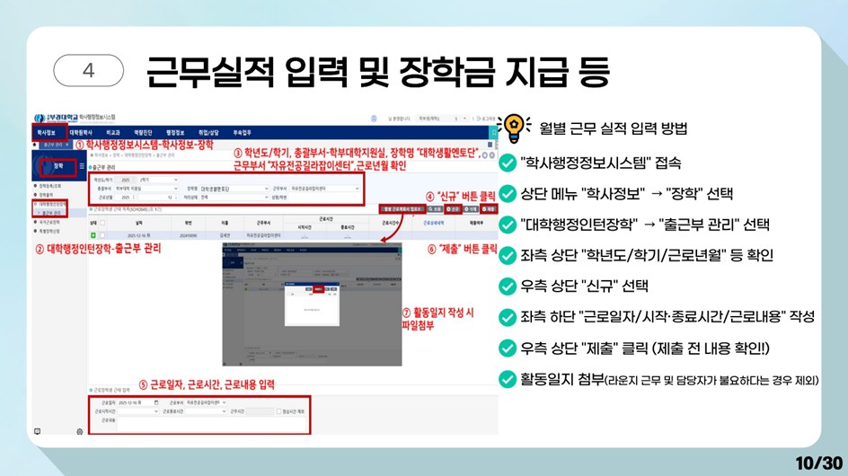 - 시스템상 수업 시간표에는 근무를 할 수 없게 되어 있습니다. - 수업시간에 근무 할 경우, 부정수급으로 판단됩니다.