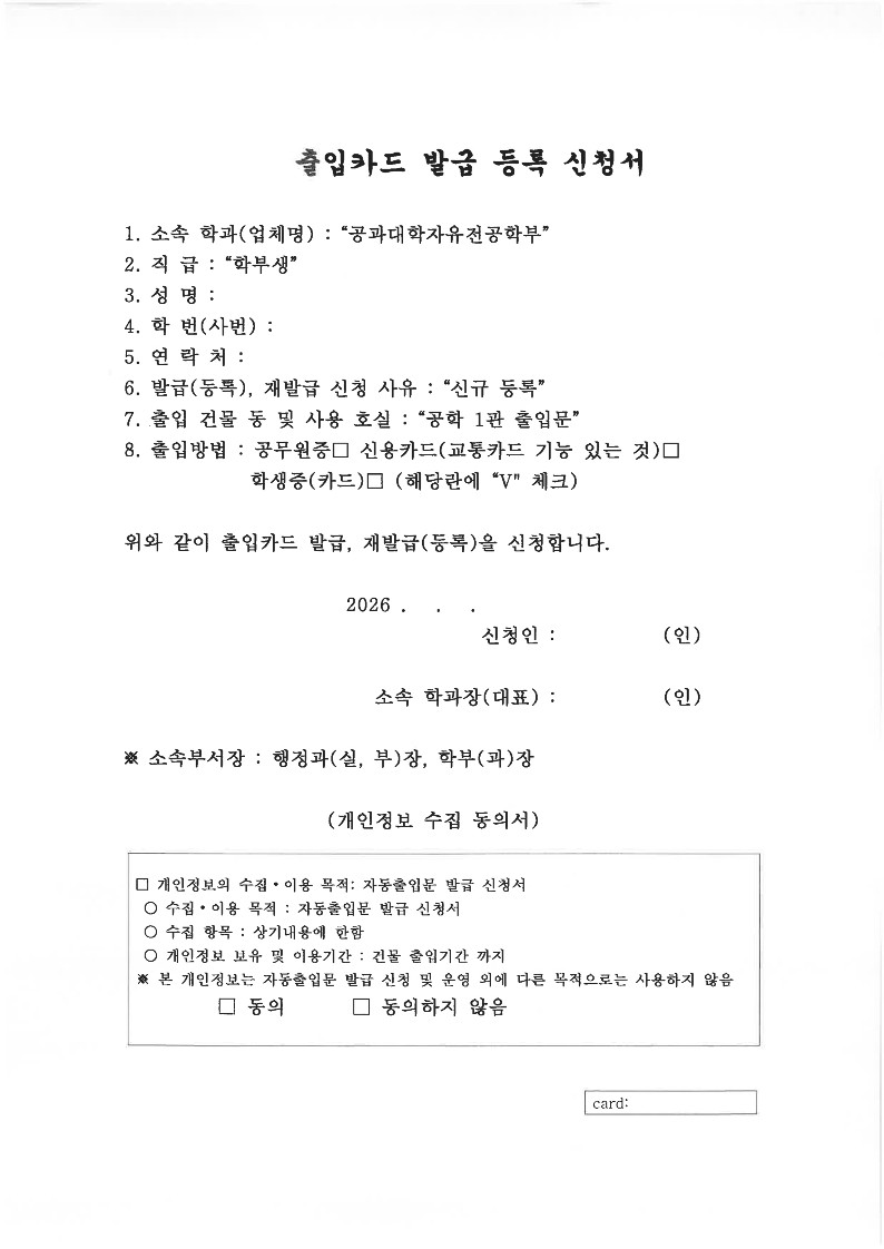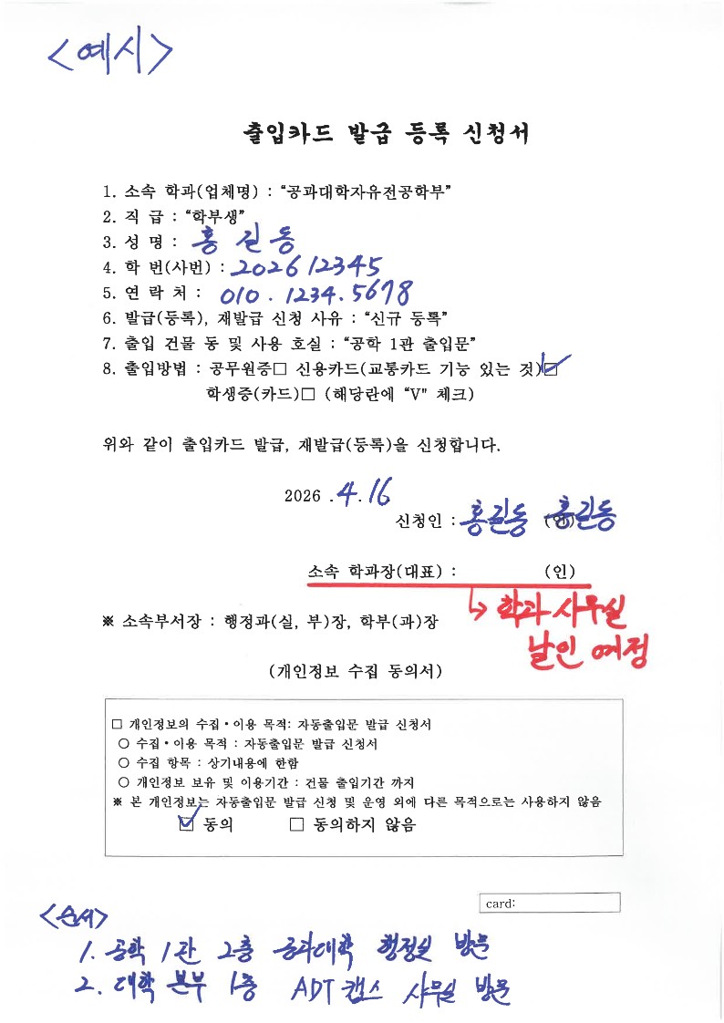 9) 신청인: 신청 학생 본인 자필 서명 10) 소속 학과장: 행정실에서 직인 날인 예정 11) 개인정보 수집 동의서: 동의 체크 V 감사합니다. 붙임 1. (PDF)출입카드 신청서 양식(공과대학자유전공학부)(2026.04.16.) 1부. 2. (JPG)출입카드 신청서 양식(공과대학자유전공학부)(2026.04.16.) 1부. 3. (예시)출입카드 신청서 양식(공과대학자유전공학부)(2026.04.16.) 1부. 끝. |