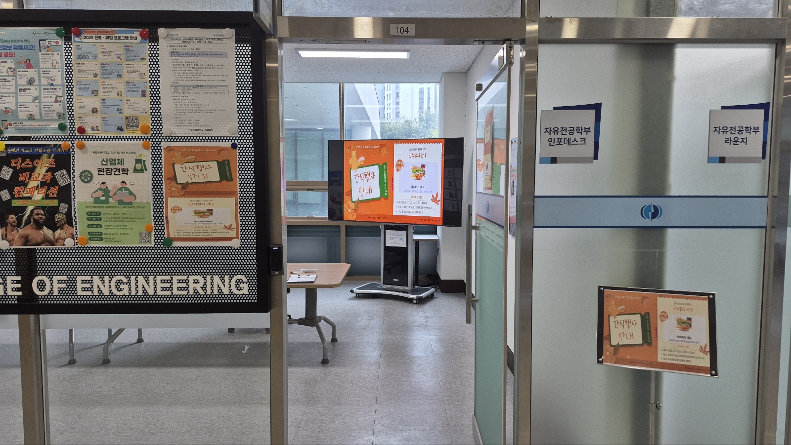 2025학년도 2학기 공과대학자유전공학부 중간고사 응원전 (간식행사) 일시: 2025. 10. 22.(수) 11:50 ~ 선착순 마감 장소: 공학 1관 1층 공과대학자유전공학부 인포데스크 주관: 공과대학자유전공학부 공과대학자유전공학부 학우님들의 중간고사 응원을 위하여, 간단한 간식을 준비하여 전달해드렸습니다. 노력하는 학우님들께, 작은 응원의 마음을 전합니다. 간식 받고, 기운내서 끝까지 화이팅 하세요.