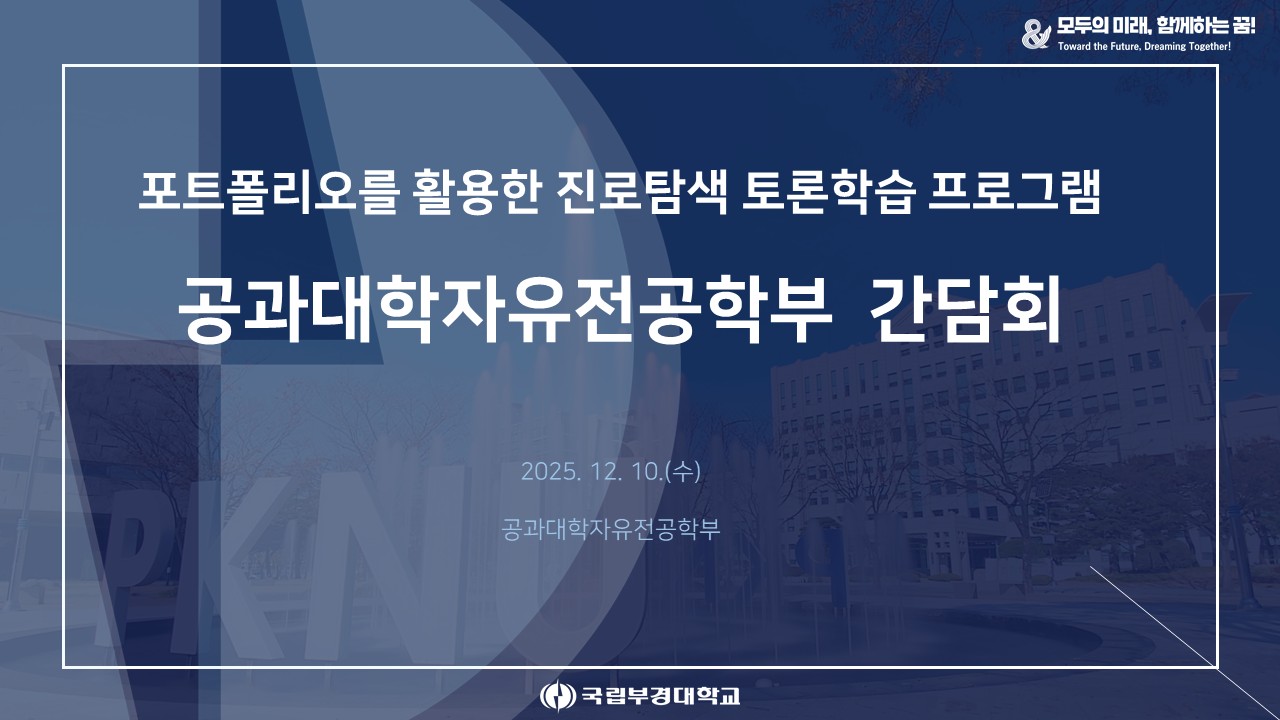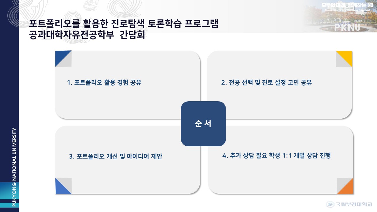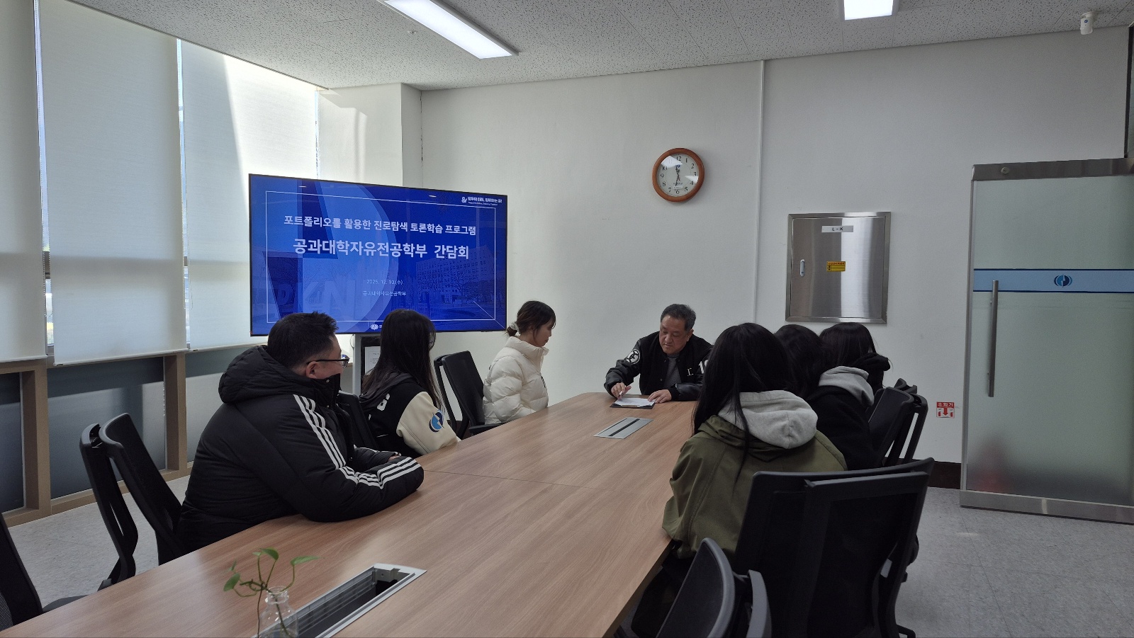 공과대학자유전공학부 간담회 일시: 2025. 12. 10.(수) 11:00~14:00 장소: 공학1관 1층 공과대학자유전공학부 인포데스크 주관: 공과대학자유전공학부 공과대학자유전공학부에서는 공과대학자유전공학부 학생분들과 함께 "포트폴리오를 활용한 진로탐색 토론학습 프로그램 - 간담회"를 진행하였습니다. 포트폴리오 활용 경험을 공유하며, 개선 아이디어 제시 및 전공 선택에 대한 고민을 공유하였습니다.