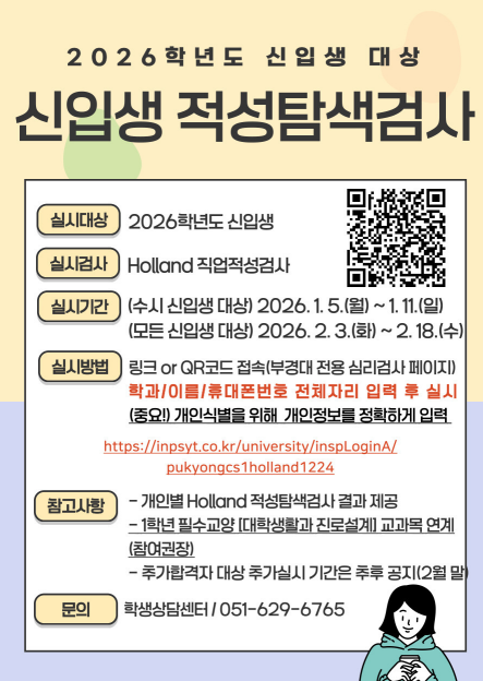 (모든 신입생 대상) 2026. 2. 3.(화) ~ 2. 18.(수) 장소: 온라인 검사 https://inpsyt.co.kr/university/inspLoginA/pukyongcs1holland1224 주관: 학생상담센터 학생상담센터에서는 2026학년도 신입생들의 진로발달을 위해 적성탐색검사를 실시합니다. 검사는 "Holland 직업적성검사"를 실시합니다. 공과대학자유전공학부 신입생 여러분의 많은 참여 바랍니다. 상세 안내 링크: https://engopen.pknu.ac.kr/engopen/7117?action=view&no=9981612