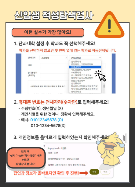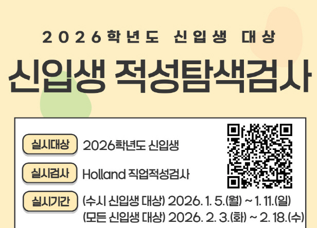 2026학년도 신입생 적성탐색검사 온라인 실시 및 실시방법 안내 일시: (수시 신입생 대상) 2026. 1. 5.(월) ~ 1. 11.(일)