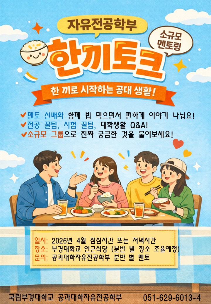 2026학년도 공과대학자유전공학부「자유전공학부 한끼토크」 일시: 2026. 4. 8.(수) ~ 4. 24.(금) 총 12회 진행 완료 장소: 국립부경대학교 및 인근 식당 주관: 공과대학자유전공학부, 공과대학 대학 생활 멘토단 공과대학자유전공학부에서는 공과대학 멘토 선배와 재학생 간의 소통을 강화하기 위하여 '식사 기반의 자유 소통형 멘토링' 을 실시하였습니다. 멘토 선배와 함께 식사하며, 편안한 분위기 속에 시험 준비에 대한 유용한 팁과 대학생활 전반에 대한 궁금증을 해소할 수 있는 뜻깊은 시간이 되었습니다. 1회차 한끼토크 - 1분반 전기공학전공 : 2026. 4. 8.(수) 12:00 - 시험 관련 조언 및 시험기간 교내 공부 장소 소개 - AI 사용 학습 팁 공유 및 추천 교양 안내 - 교내 각종 행사 안내